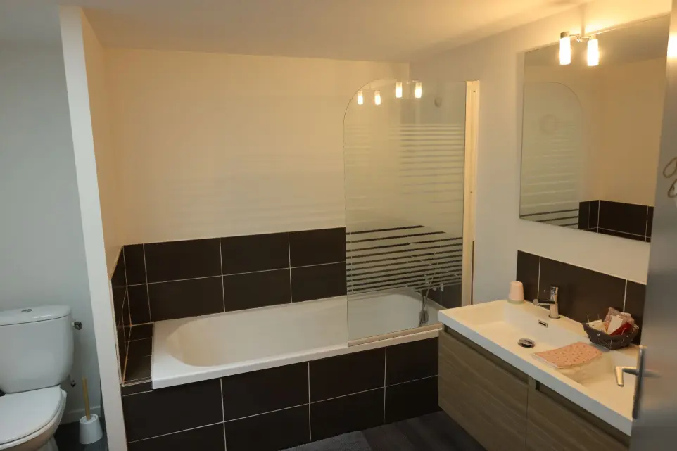 La salle de bain comprend une douche et un lave-linge. Les WC sont séparés.